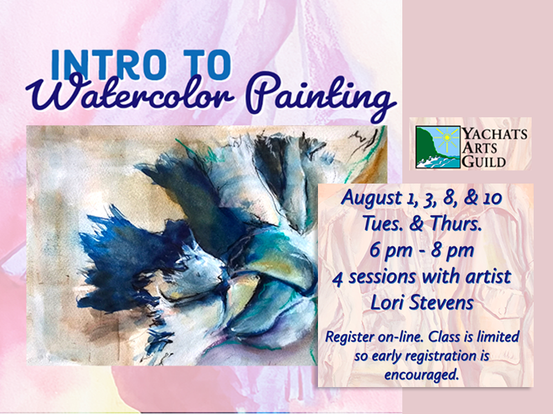 Intro to Watercolor Painting with Lori Stevens – 4 sessions.Dates: Tuesdays and Thursdays, August 1, 3, 8 and 10Time: 6 pm