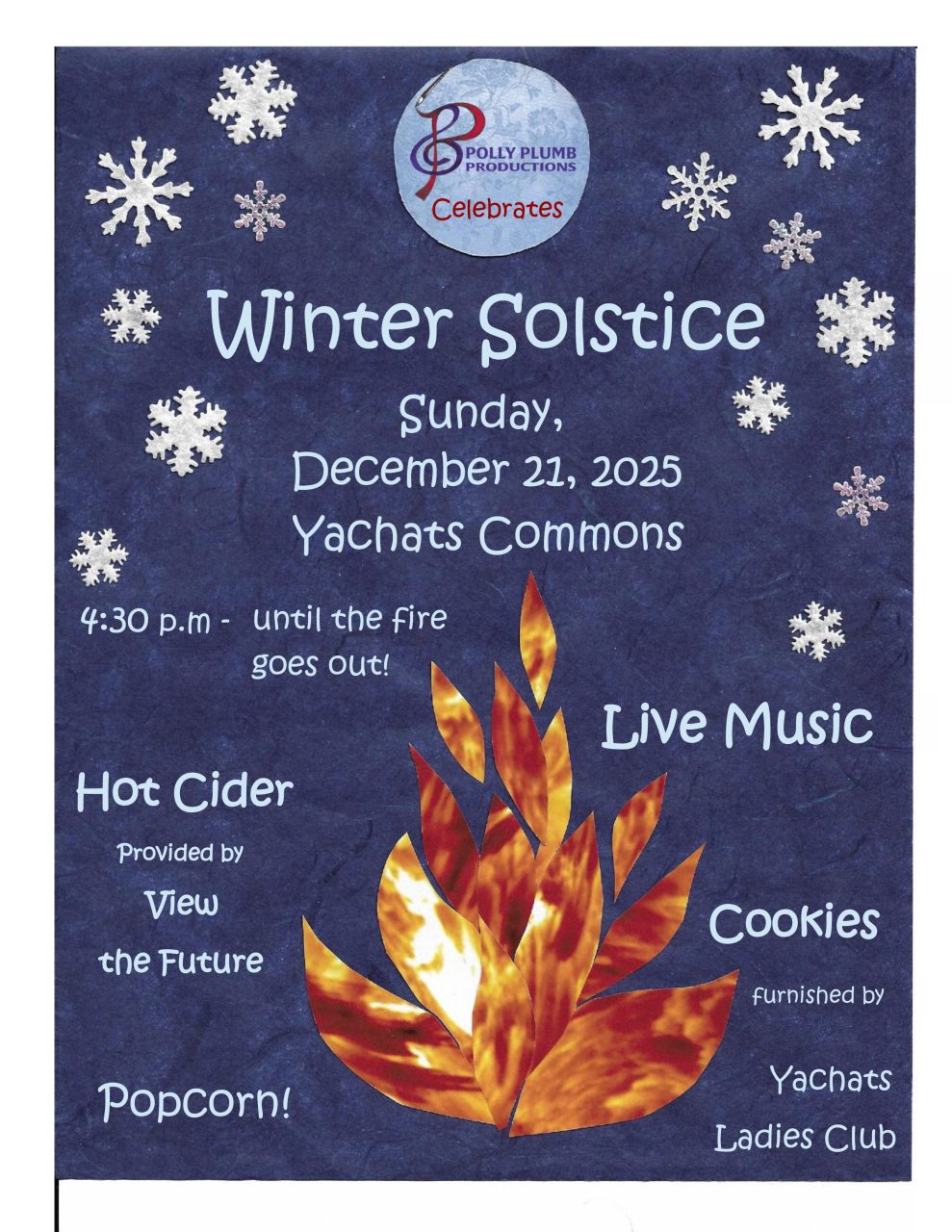 Winter Solstice Celebrates Saturday, December 21, 2024 Yachats Commons Pavilion 4:00 until 7:00 pm Cookies furnished by Yachats Ladies Club Hot