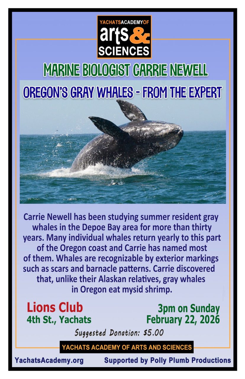 Marine Biologist Carrie Newell February 22, 2026 Sunday, 3 pm, $5.00 donation Yachats Lions Club, 4th street Polly Plumb Productions