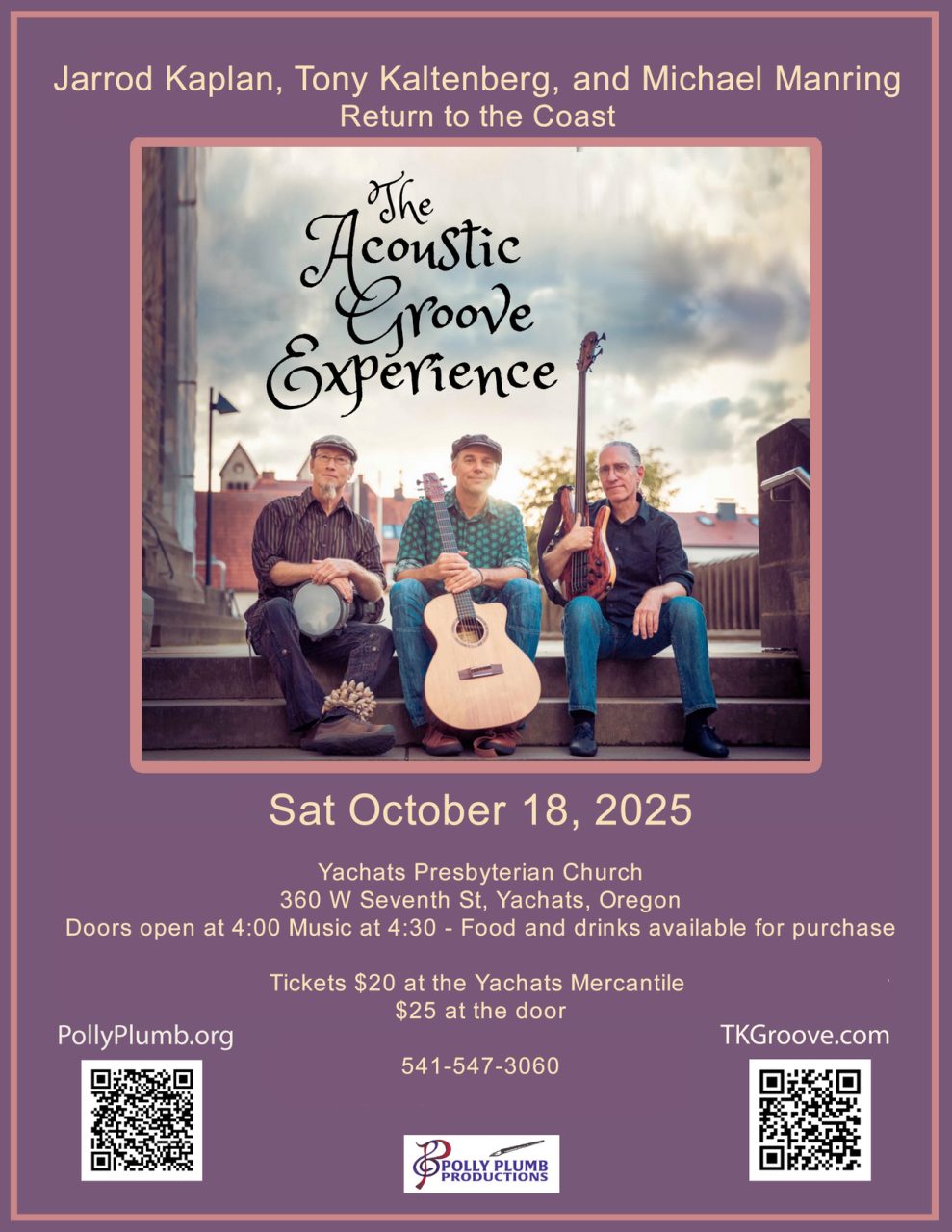 Join us for an unforgettable evening of live music with Jarrod Kaplan, Tony Kaltenberg, and Michael Manring as they bring their acclaimed The Acoustic Groove Experience back to the Oregon Coast. Known for their captivating blend of instrumental mastery and rhythmic groove, this performance promises to be a highlight of the fall music season.